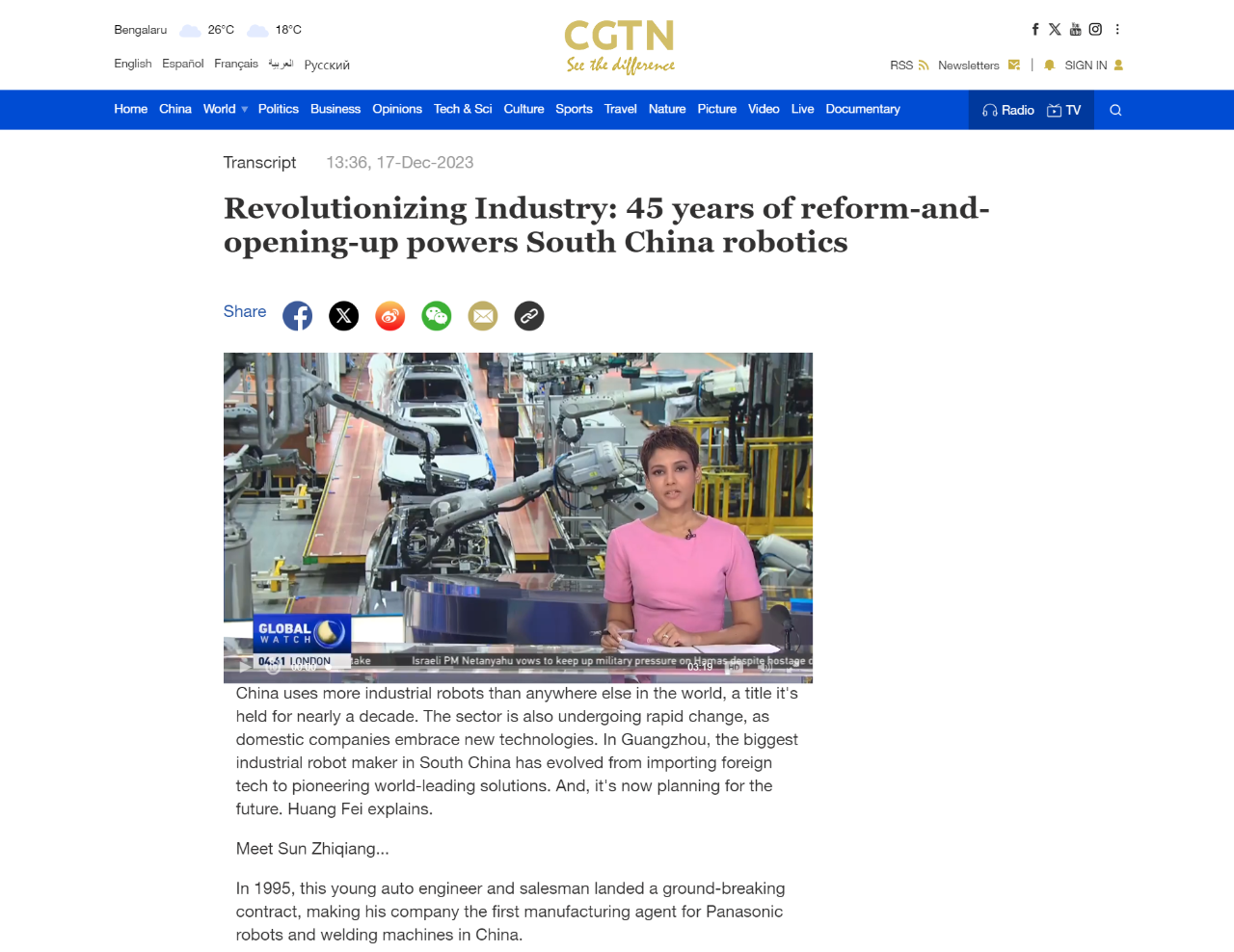 中央電視臺(tái) | CGTN:改革開(kāi)放45年助力華南機(jī)器人