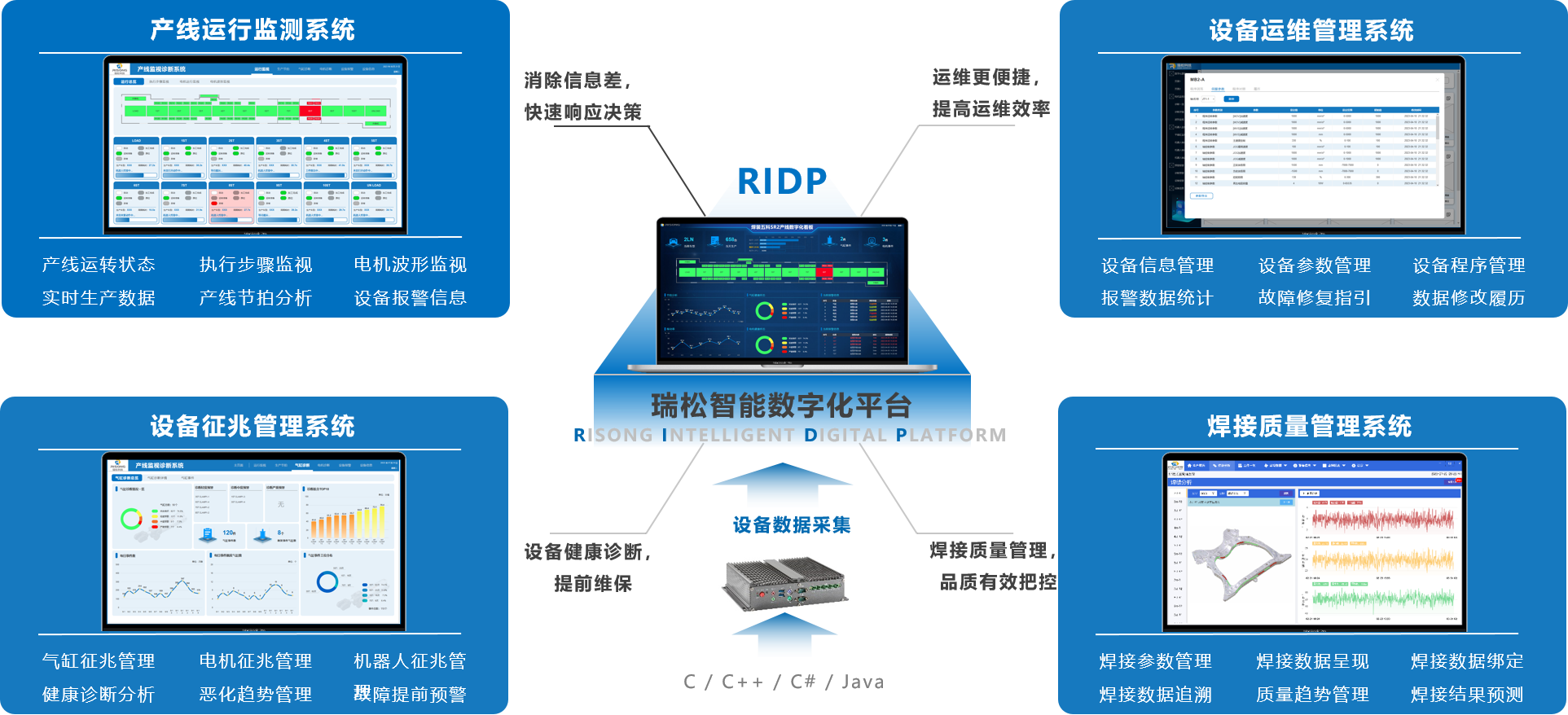 【數(shù)字化平臺RIDP】包含了產(chǎn)線運行監(jiān)測系統(tǒng)、設(shè)備運維管理系統(tǒng)、設(shè)備征兆管理系統(tǒng)、焊接質(zhì)量管理系統(tǒng),通過數(shù)據(jù)將人與機(jī)器緊密鏈接起來,將產(chǎn)線、設(shè)備運維、設(shè)備診斷、焊接監(jiān)視等數(shù)據(jù)系統(tǒng)整合,做到生產(chǎn)管理的可視化、便捷化、直觀化、數(shù)據(jù)化,實現(xiàn)產(chǎn)線的精細(xì)化管理。