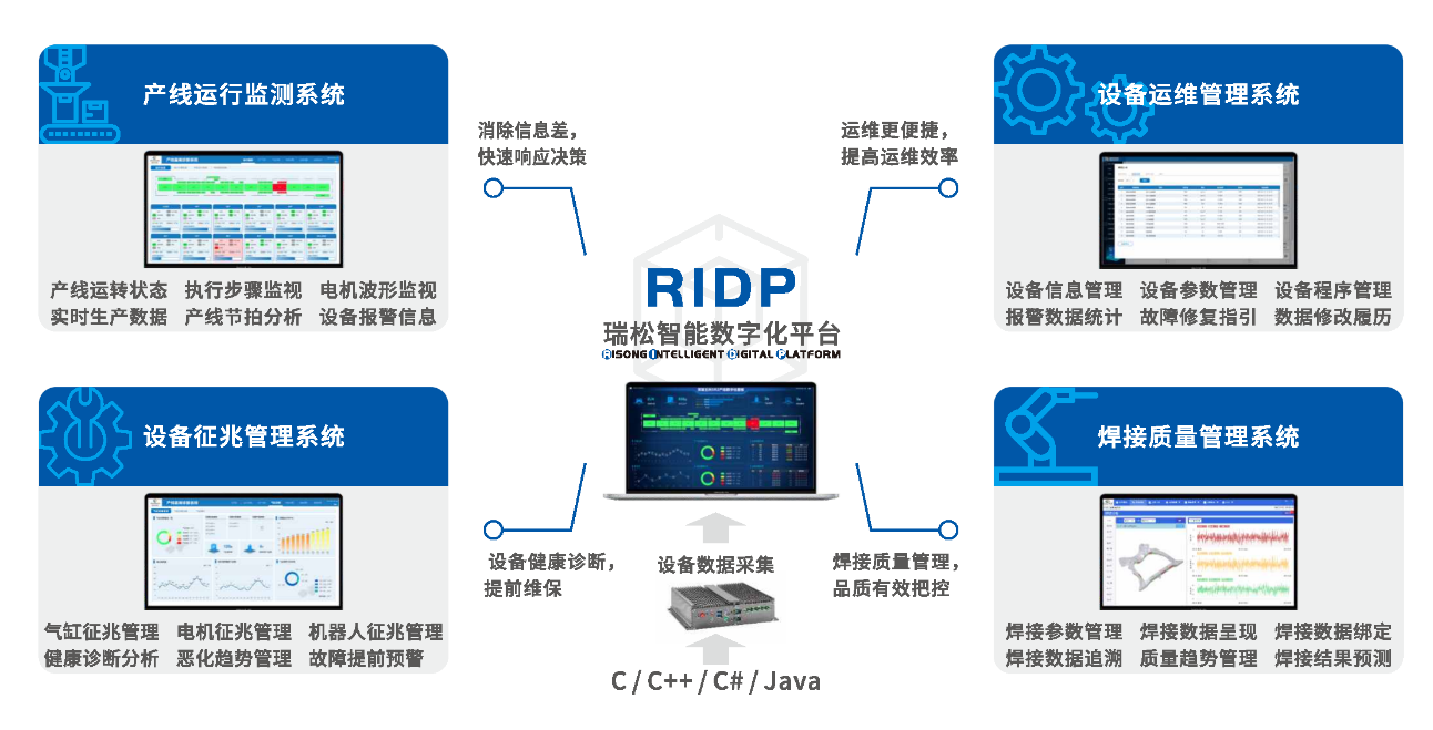 瑞松科技基于工業(yè)互聯(lián)網(wǎng)技術(shù)和積累的大量基礎(chǔ)應(yīng)用數(shù)據(jù),開(kāi)發(fā)了制造信息管理可視化平臺(tái)、工藝管理云平臺(tái)、遠(yuǎn)程運(yùn)維平臺(tái)等。其中,應(yīng)用于汽車制造領(lǐng)域【數(shù)字化平臺(tái)RIDP】將人、機(jī)器和數(shù)據(jù)緊密鏈接起來(lái),通過(guò)將產(chǎn)線、設(shè)備運(yùn)維、設(shè)備診斷、焊接監(jiān)視等數(shù)據(jù)系統(tǒng)整合,實(shí)現(xiàn)了生產(chǎn)管理的可視化、便捷化、直觀化、數(shù)據(jù)化、精細(xì)化,賦予汽車制造行業(yè)生態(tài)體系高效、智能的云端工業(yè)能力。