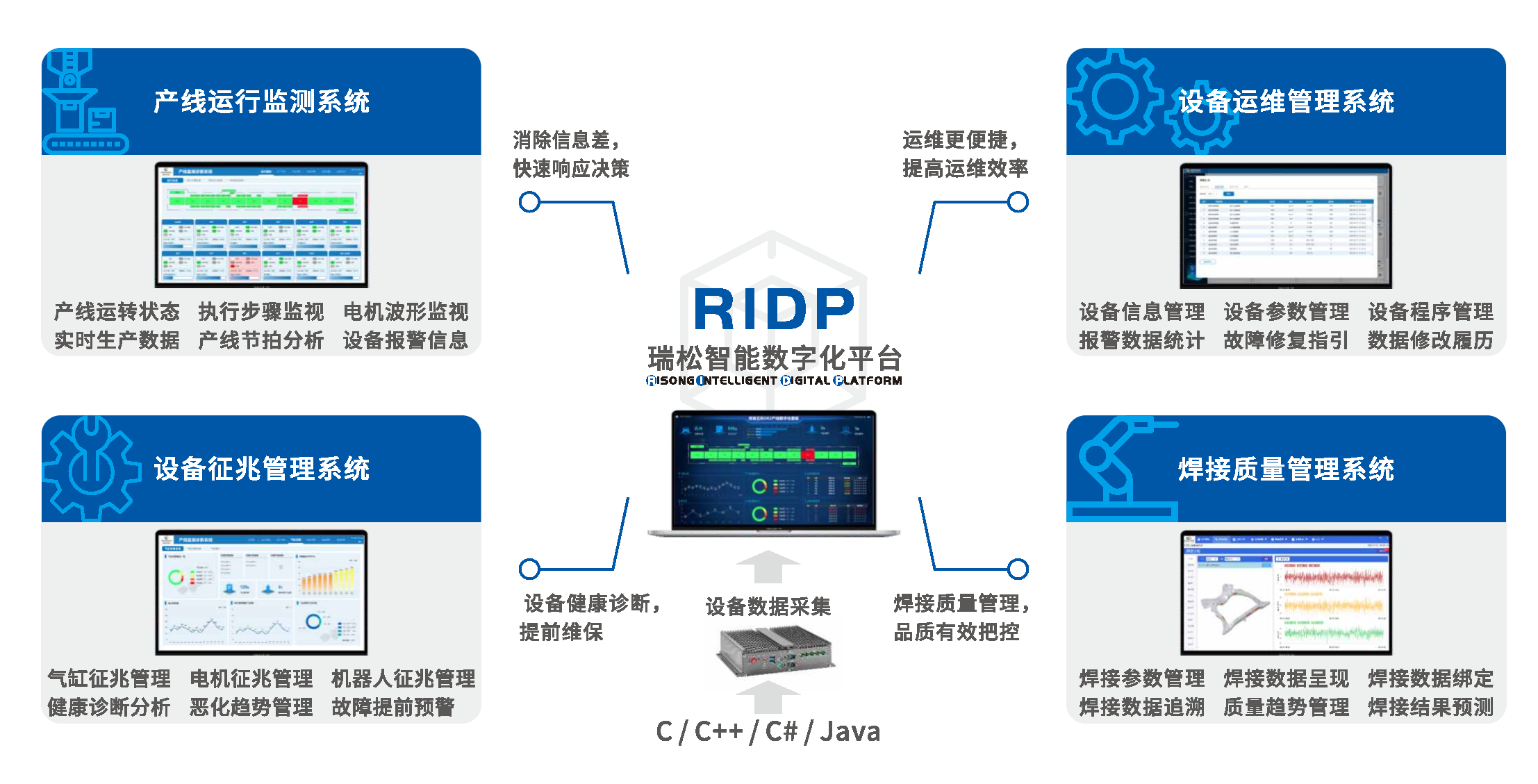 瑞松科技自主研發(fā)的數(shù)字化平臺RIDP,以數(shù)字孿生為核心,打造出與現(xiàn)實生產(chǎn)環(huán)境高度契合的虛擬映射空間。開發(fā)了基于大數(shù)據(jù)的高速采集、存儲與清洗技術(shù),基于人工智能的數(shù)據(jù)挖掘與分析技術(shù),實現(xiàn)從生產(chǎn)環(huán)節(jié)的精細化管控、設(shè)備狀態(tài)的實時監(jiān)測與預(yù)測性維護,到運維流程的智能化、品質(zhì)把控的全流程追溯以及能源管理的高效優(yōu)化,進一步推進制造業(yè)數(shù)字化轉(zhuǎn)型升級。