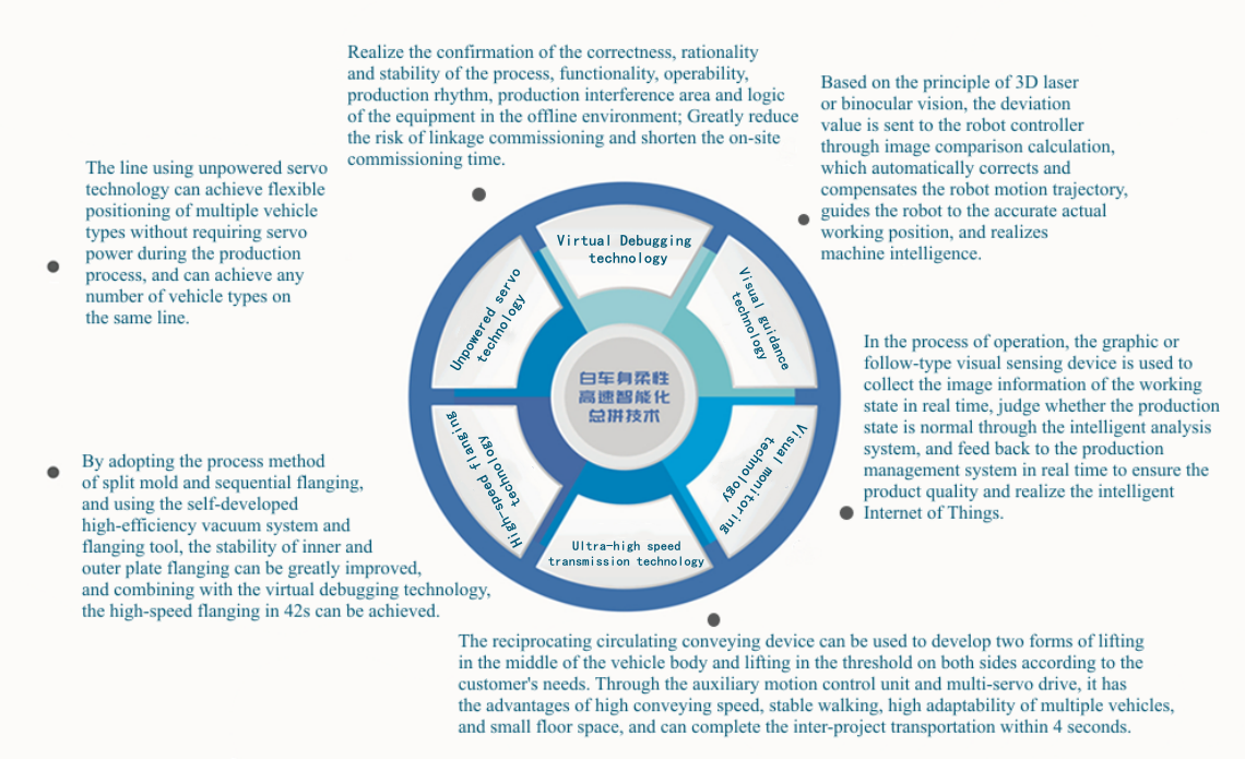 The flexible high-speed intelligent assembly technology of body-in-white realizes the flexible high-speed intelligent production of body-in-white by comprehensively using visual guidance, servo positioning, flexible passive trolley, intelligent vehicle switching device, flexible flanging, offline debugging and other technologies.