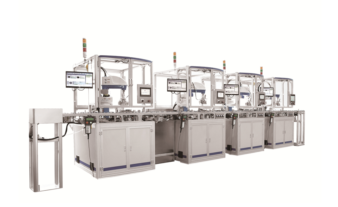 ??該生產(chǎn)線由4個(gè)單機(jī)型機(jī)器人工作站組成,通過集成視覺檢測(cè)及對(duì)位、治具自動(dòng)裝配、自動(dòng)上PCB板、自動(dòng)點(diǎn)膠、自動(dòng)貼裝芯片及其它各種輔材等功能來實(shí)現(xiàn)IC的疊裝生產(chǎn)。采用模塊化柔性線體設(shè)計(jì),可根據(jù)不同產(chǎn)品工藝添加或減少工作站來進(jìn)行相對(duì)應(yīng)的作業(yè)。采用高精度SCARA機(jī)器人與高精密視覺檢測(cè)及對(duì)位系統(tǒng)的配合,工作效率高,精度高達(dá)±0.02mm,且組裝穩(wěn)定性高,可滿足客戶多種產(chǎn)品的切換。
